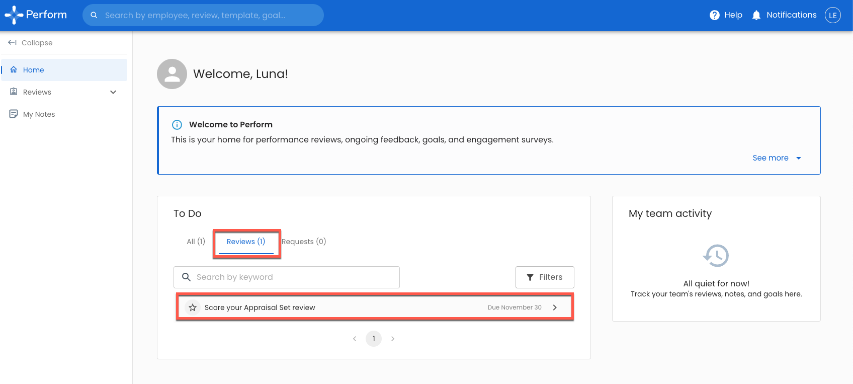 Step 1: Select the Reviews list on your Dashboard and click Score your Appraisal Set review.