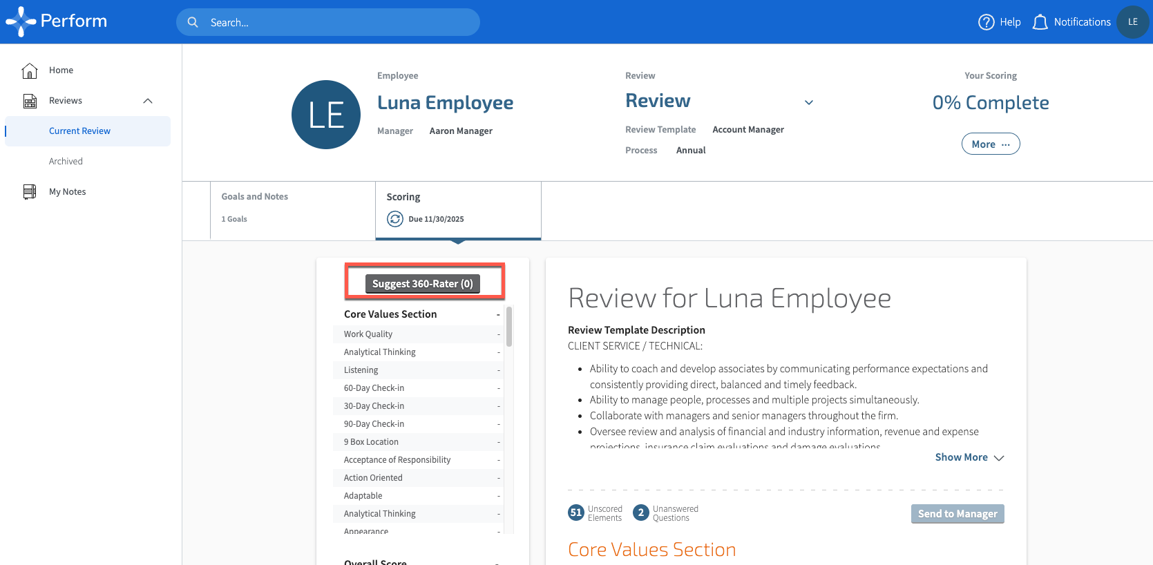 The ability to suggest 360-Rater feedback may only be available to some Trakstar Perform sites. It is also only available to the employee when the review is in scoring.