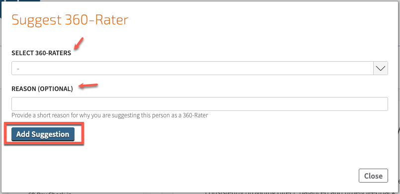 Step 3: Select a 360-Rater using the dropdown. This is a complete list of your organization and allows you to add an outside respondent suggestion. You can add a reason if you would like to let your manager know why you are requesting the individual—Click Add Suggestion to save your choice.