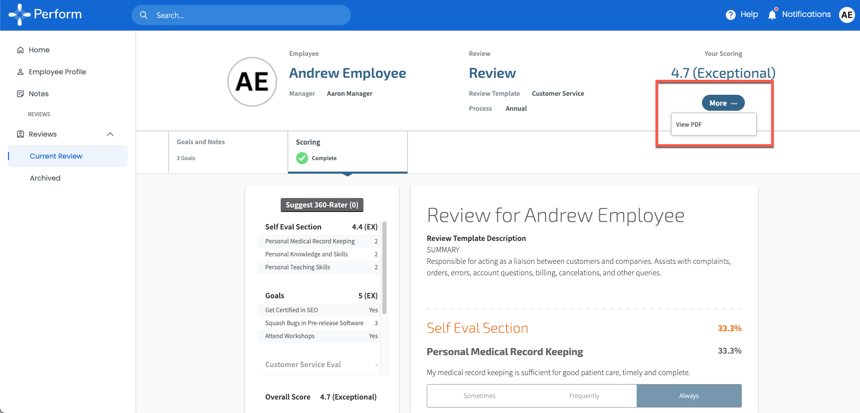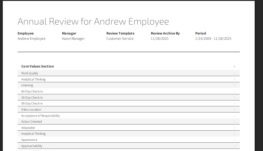 Step 4: Trakstar Perform will generate a preview of your printable review in the browser. You can select opt to Download the review to your computer or Print the review from this screen.