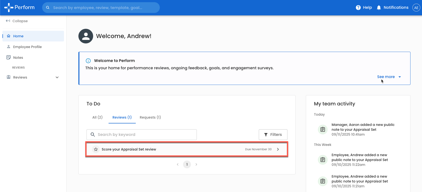 Step 1: On your Dashboard, under your To Do list, select the Reviews filter and select your review. Click the button to the right of your current view. If the review is in “Goals and Notes,” click on ‘Set Goals.’ If the review is in scoring, click on ‘Score Review.’