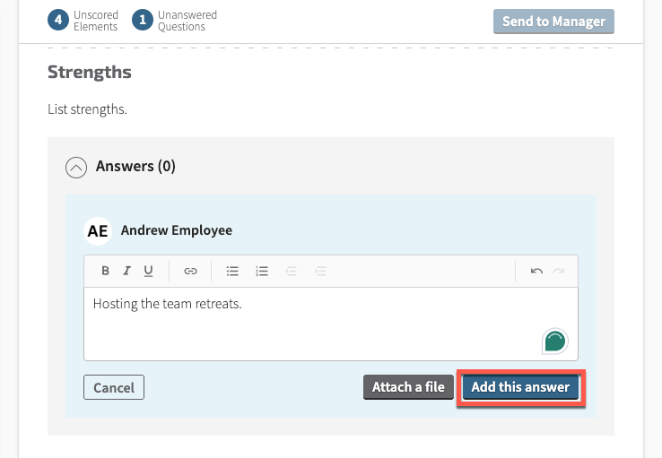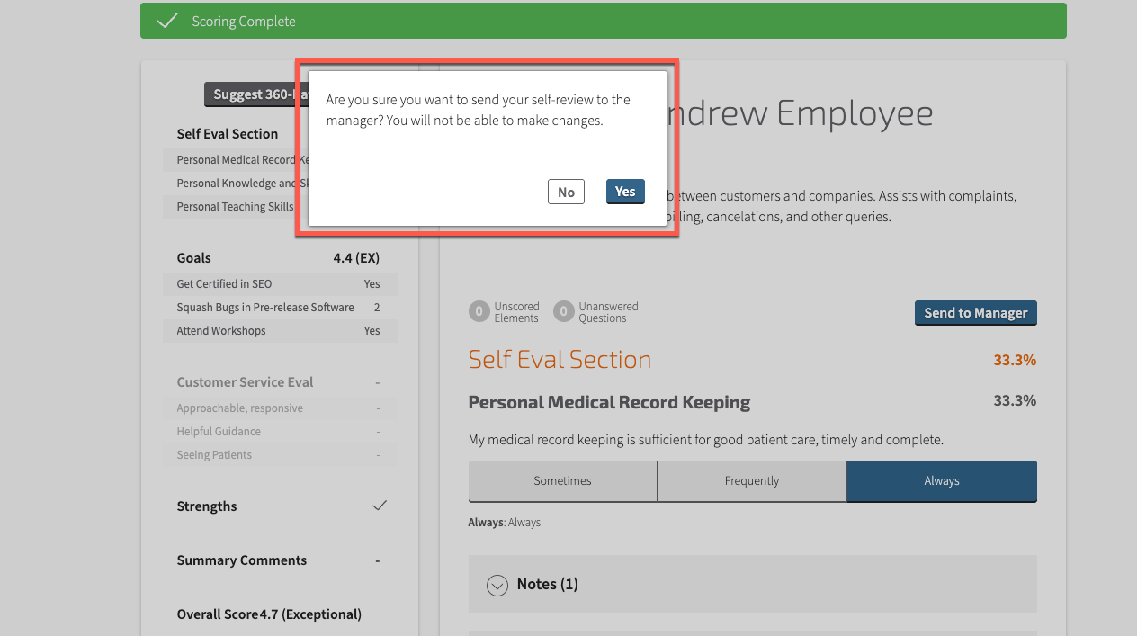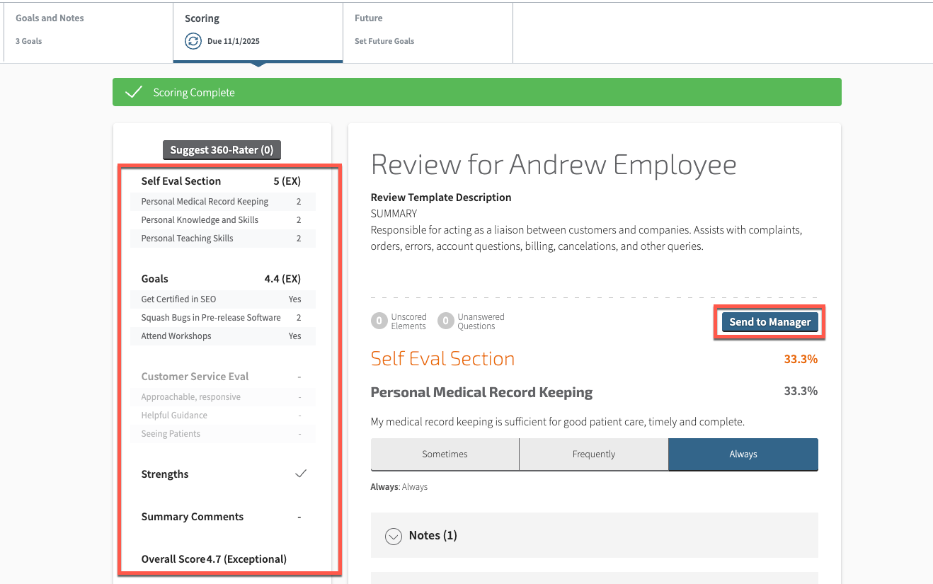 Step 5: When the review is complete, all competencies in the Review Summary area will display either a score or a checkmark. An Overall Score is also calculated if your site administrators have enabled it. At this stage, you can make any final changes to the review. When you are finished, select Send to Manager.