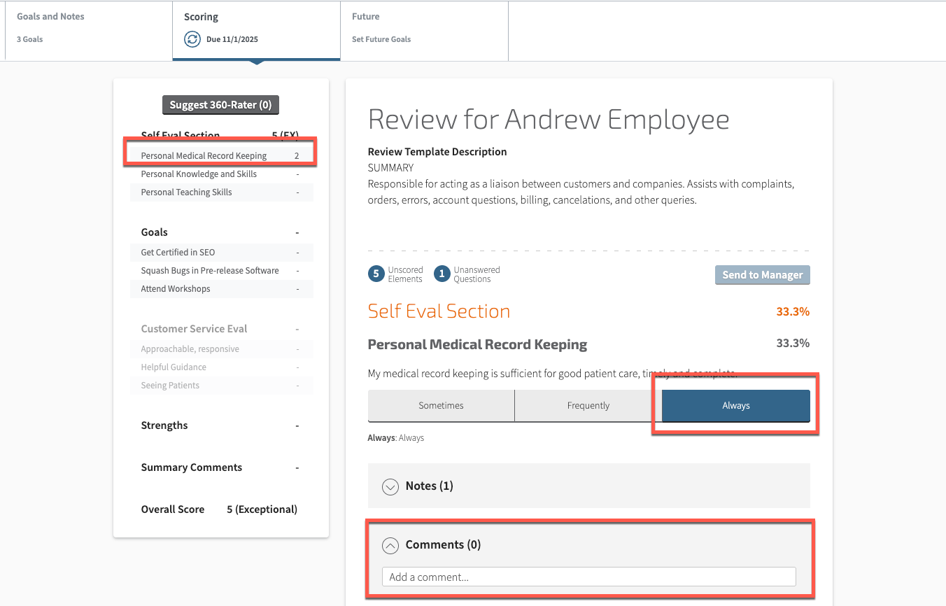 Step 2: Select the appropriate rating and add a comment, if desired. An abbreviated score will appear in the Review Summary on the left-hand side to indicate that the Employee has rated the competency.