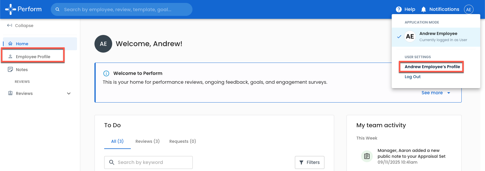 Step 1: When logged into Trakstar Perform as a user, click your Initial from the right-hand corner of your Home page and then your Profile or Employee Profile from your navigation bar.