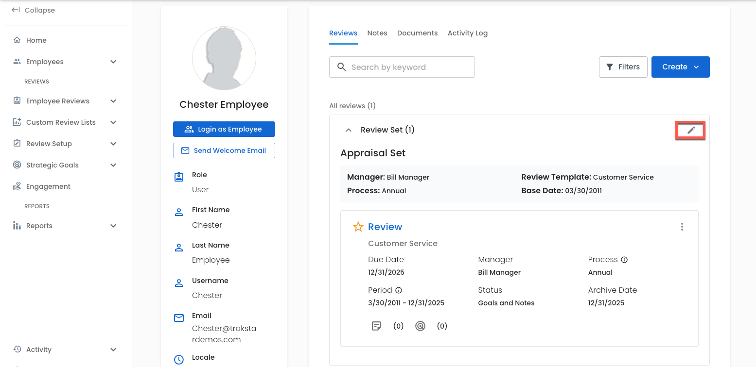 Click the Pencil icon on the employee’s profile next to the “Review Sets” header to change the employee’s manager or Review Template.