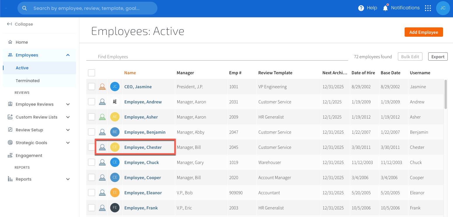 - Leave: The evaluating data will be retained if the document is in the Scoring phase. The employee will be moved to the new manager upon an archive of the current review document. Goals and Notes will be retained.