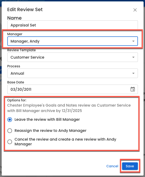 When changing an employee’s manager, you will be presented with three options on how to proceed with the current review: