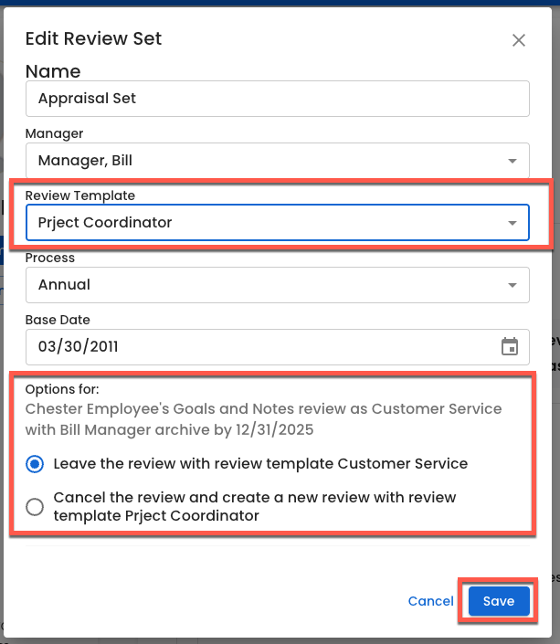 When changing an employee’s Review Template (formerly known as Position), you will be presented with two choices on how to proceed with the current review:
