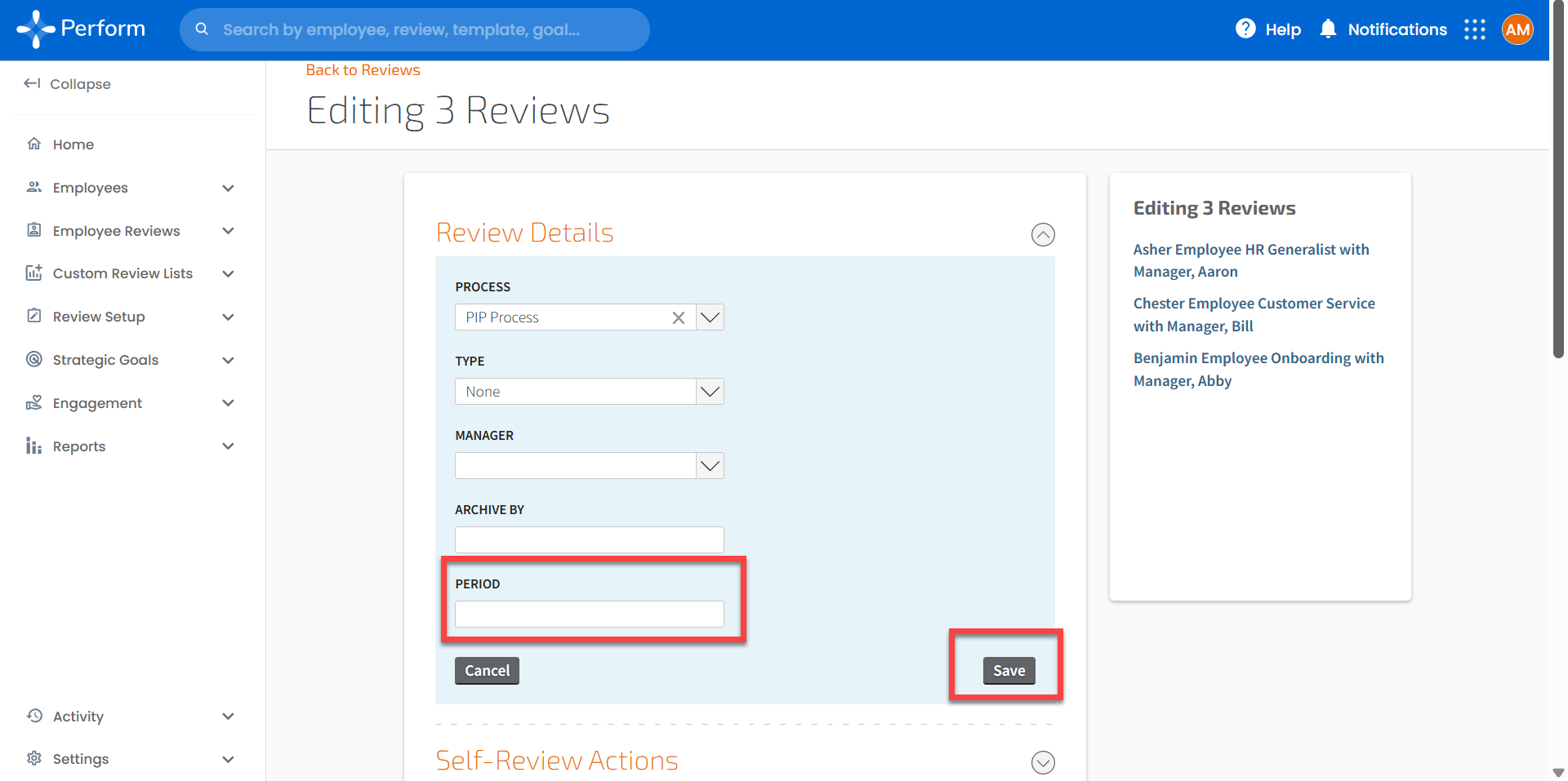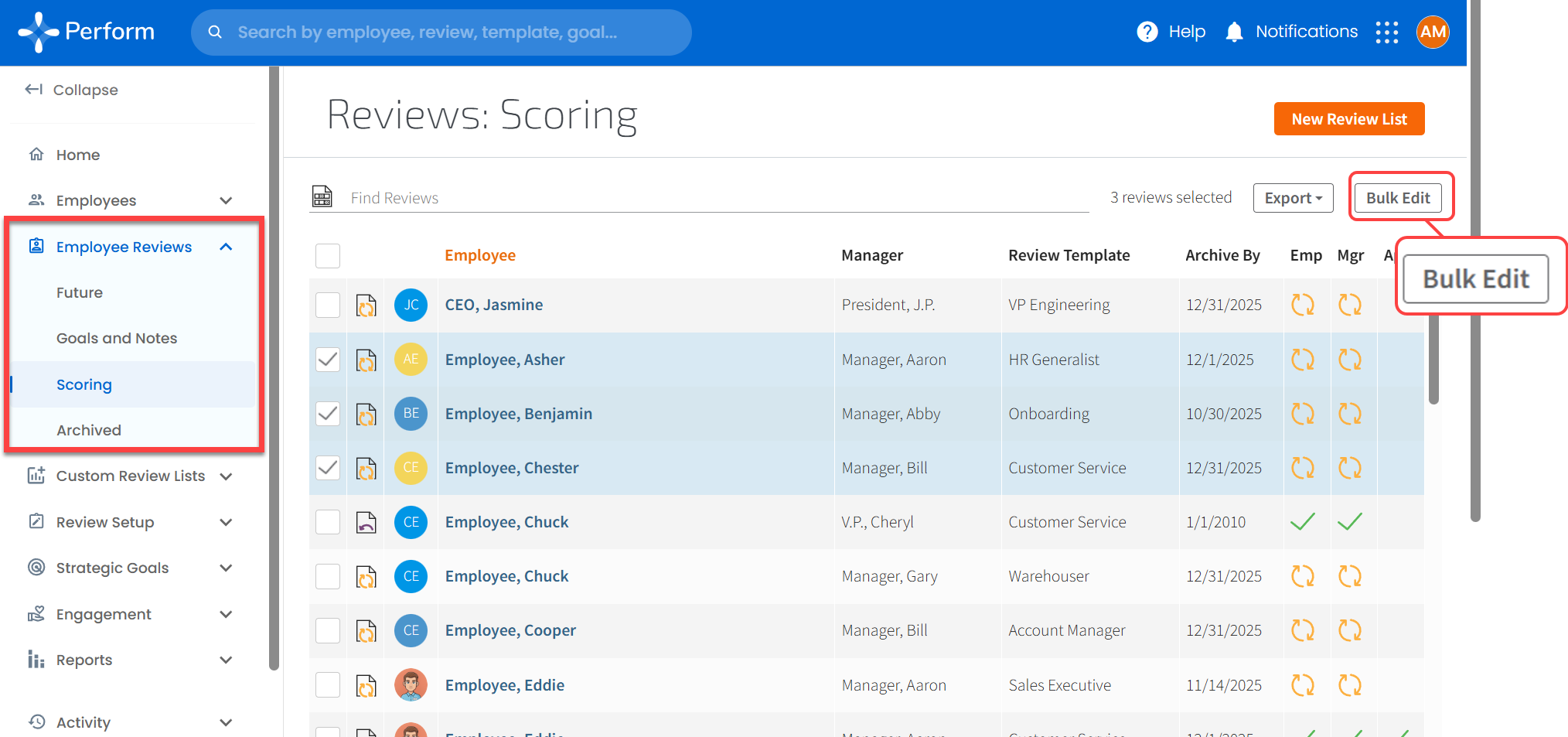 Log in as Admin. Select the Reviews to tab in the Navigation bar. Click the check box next to each employee you wish to change the review period for. Click the Bulk Edit button at the top right of the page.