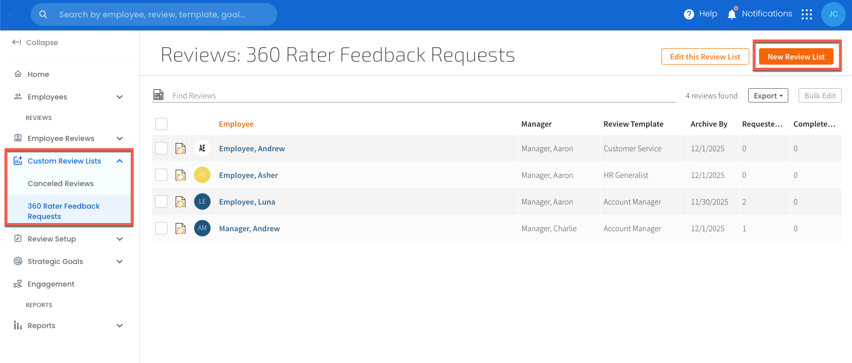 Step 5: The report is now visible to the Trakstar Perform Administrator. To delete or edit the report, select Edit this Review List on the right. Additionally, the list may be exported to a spreadsheet by clicking the Export button in the top right.