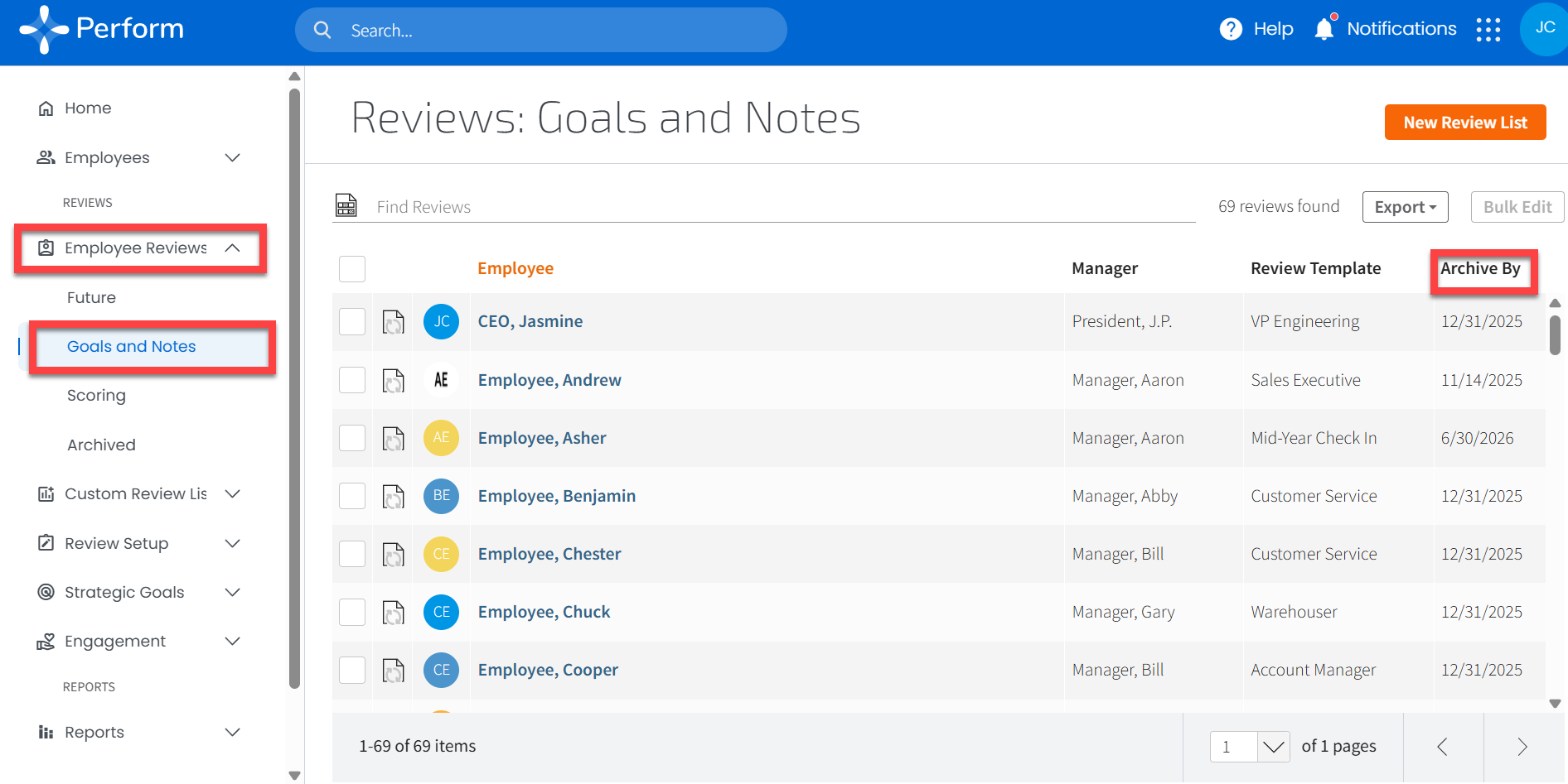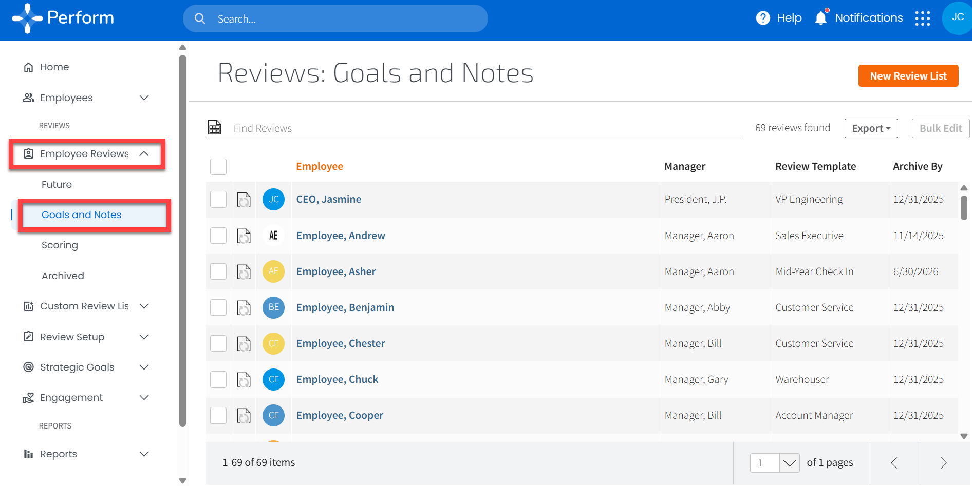 Select under the dropdown in 'Employee Reviews' and the review list you would like to view. (Goals and Notes, Scoring, or any Custom List created).