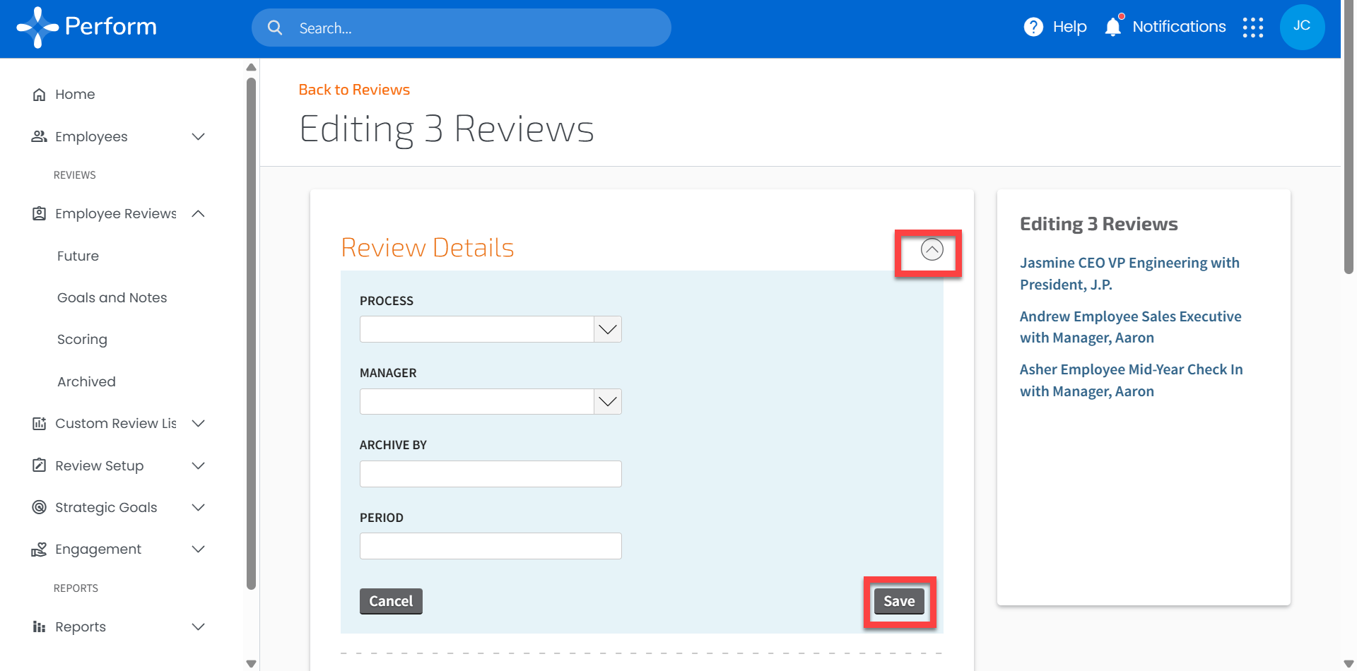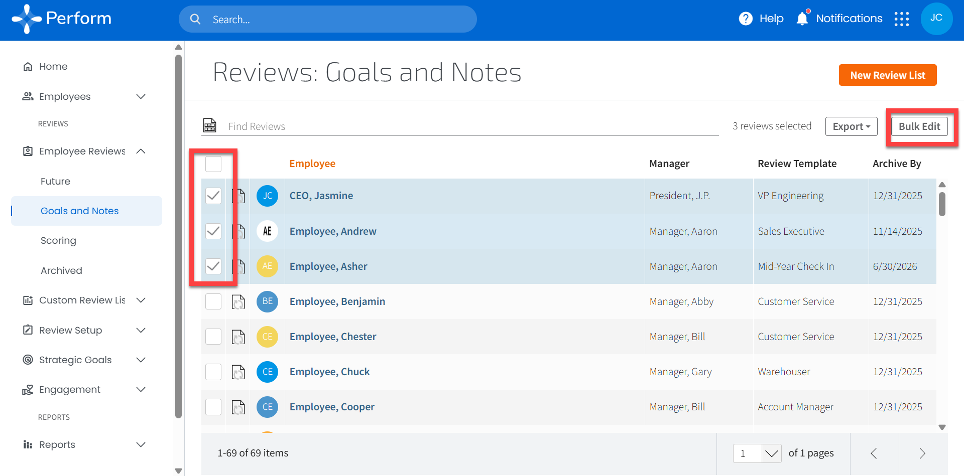 Select those reviews you would like to edit by checking the box next to the Employee’s Name.