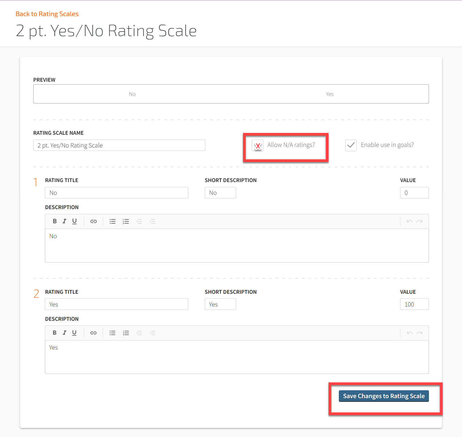 - Check the box for Allow N/A ratings? and then click Save Changes to Rating Scale to reflect the change made.