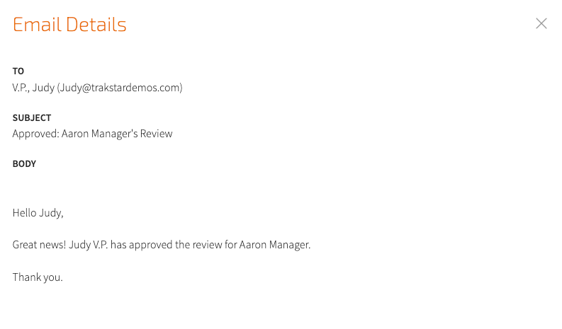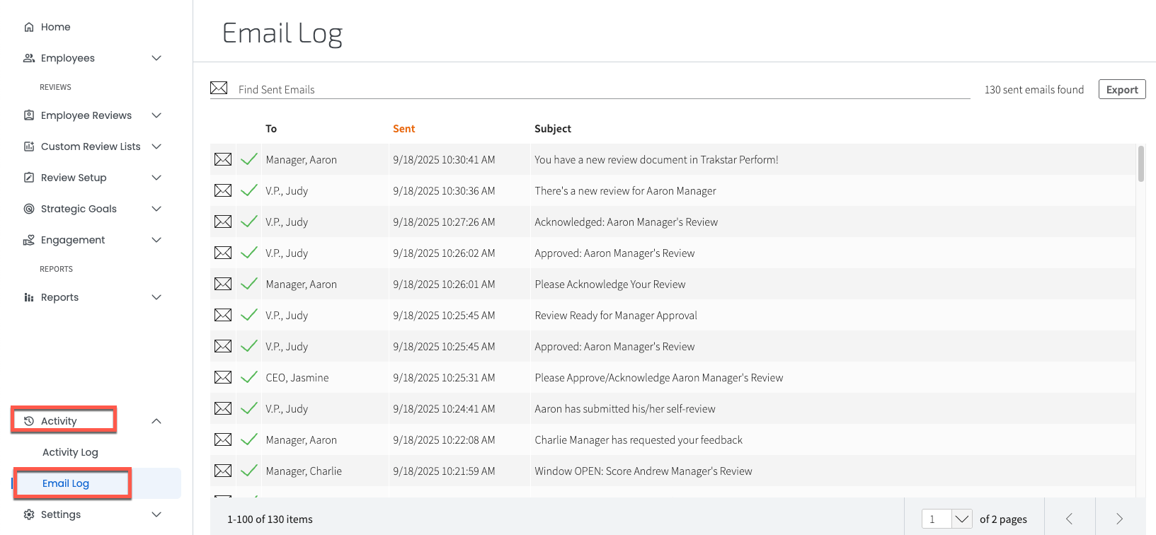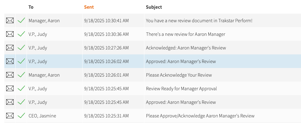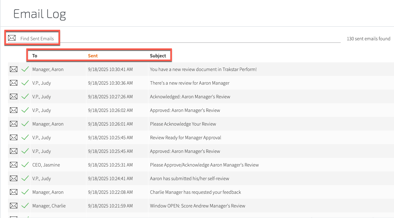 The Email Log in Trakstar Perform allows administrators to see what emails have gone out to users. This is a great way to see if a user has received a Welcome Email or Multi-Rater requests. The email log can be reviewed to see what emails have gone out to your users from Trakstar Hire. You can edit your email reminders schedule and content under Settings > Emails.