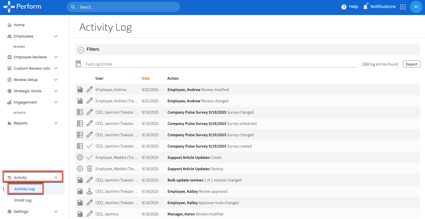 Trakstar Perform's Log is a tool that allows administrators to see activity history within their Trakstar Perform site. It can be searched and filtered by user, date, and action, as well as by the names of user,s making it easy to search for specific activity.