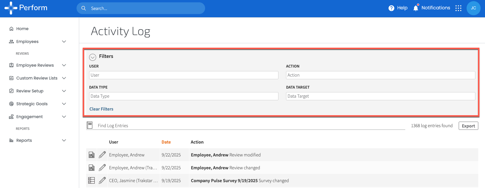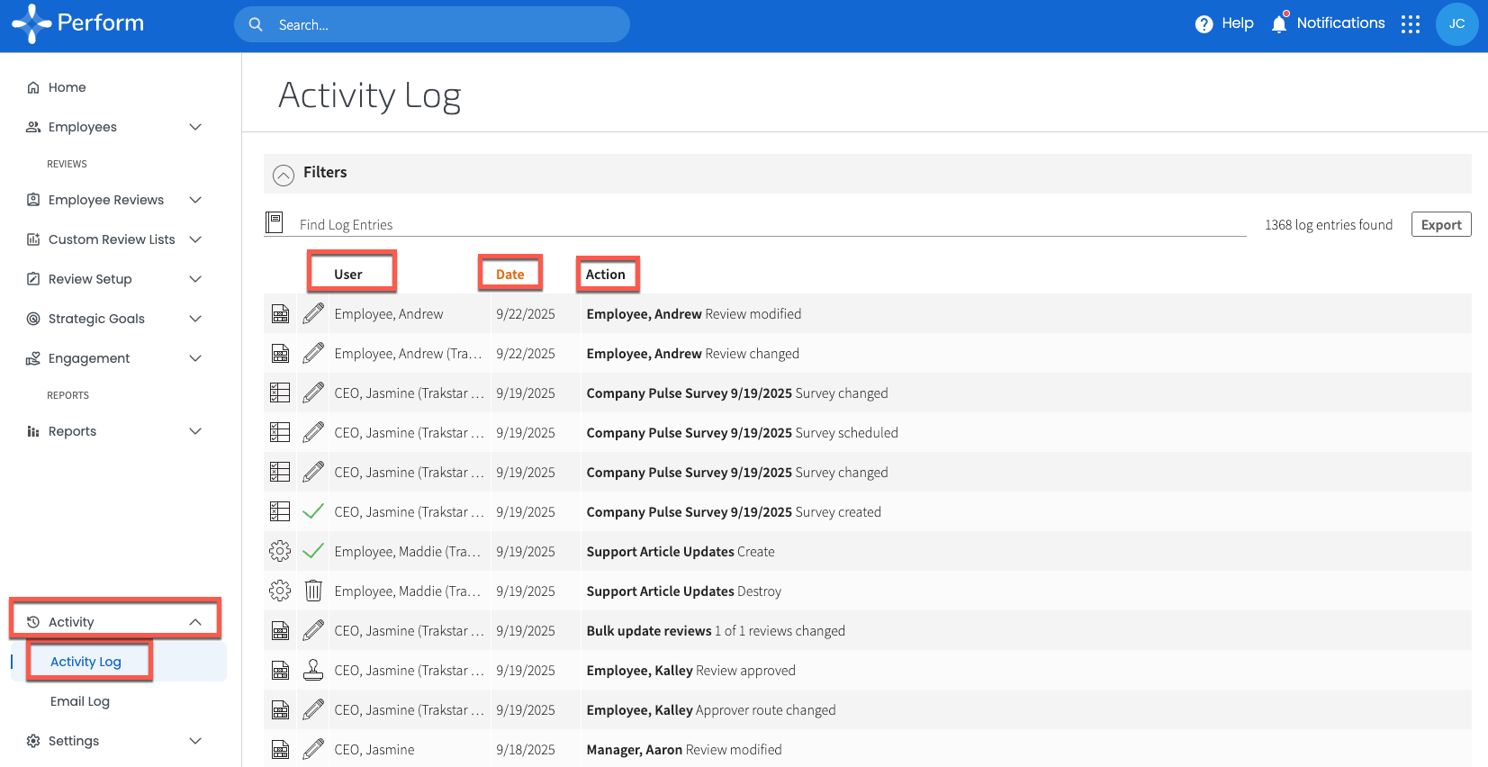 The Log reveals all user actions within Trakstar Perform. Sort the data by User, Date, or Action. You can search for specific terms using the "Find Log Entries" search bar.