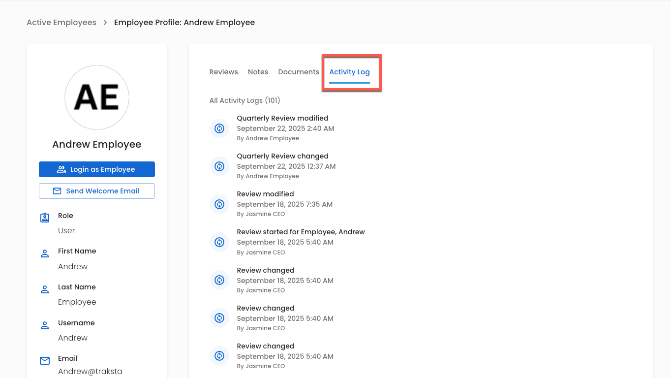 To view a specific employee’s log, click on their name from the employee list. From their profile page, select Activity Log. This Audit Log is specific to the employee.