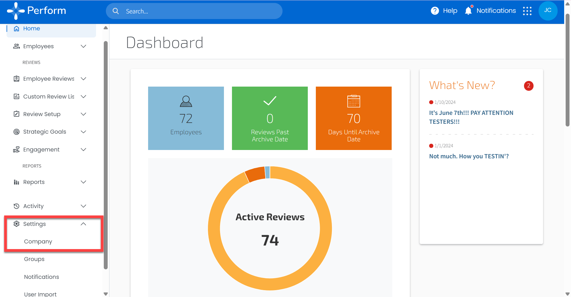 Step 1: Log in as Admin. Select the Settings to tab from the Navigation Bar. Select Company from the pull-down menu.
