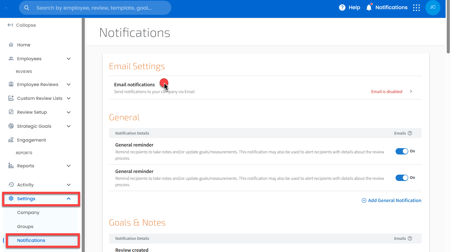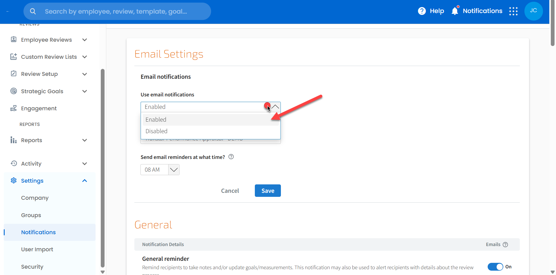 How to enable your email notifications to employees from Trakstar Perform. You can also enable and disable individual email notifications under Settings > Notifications.