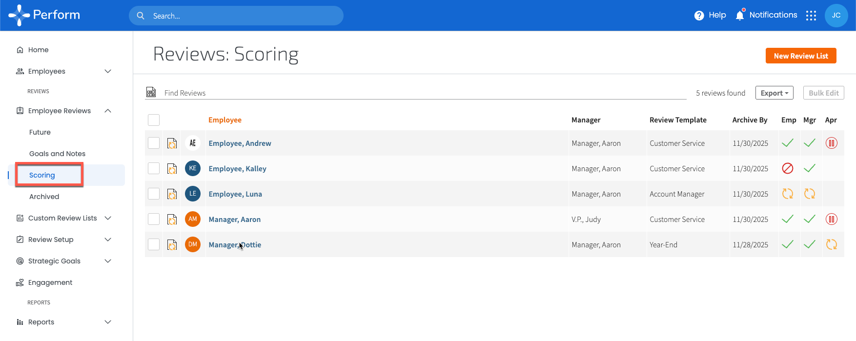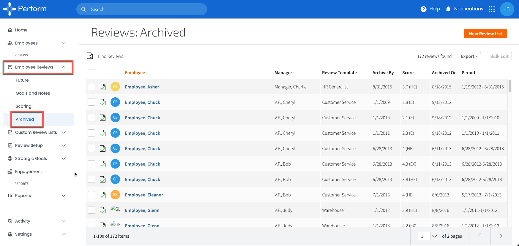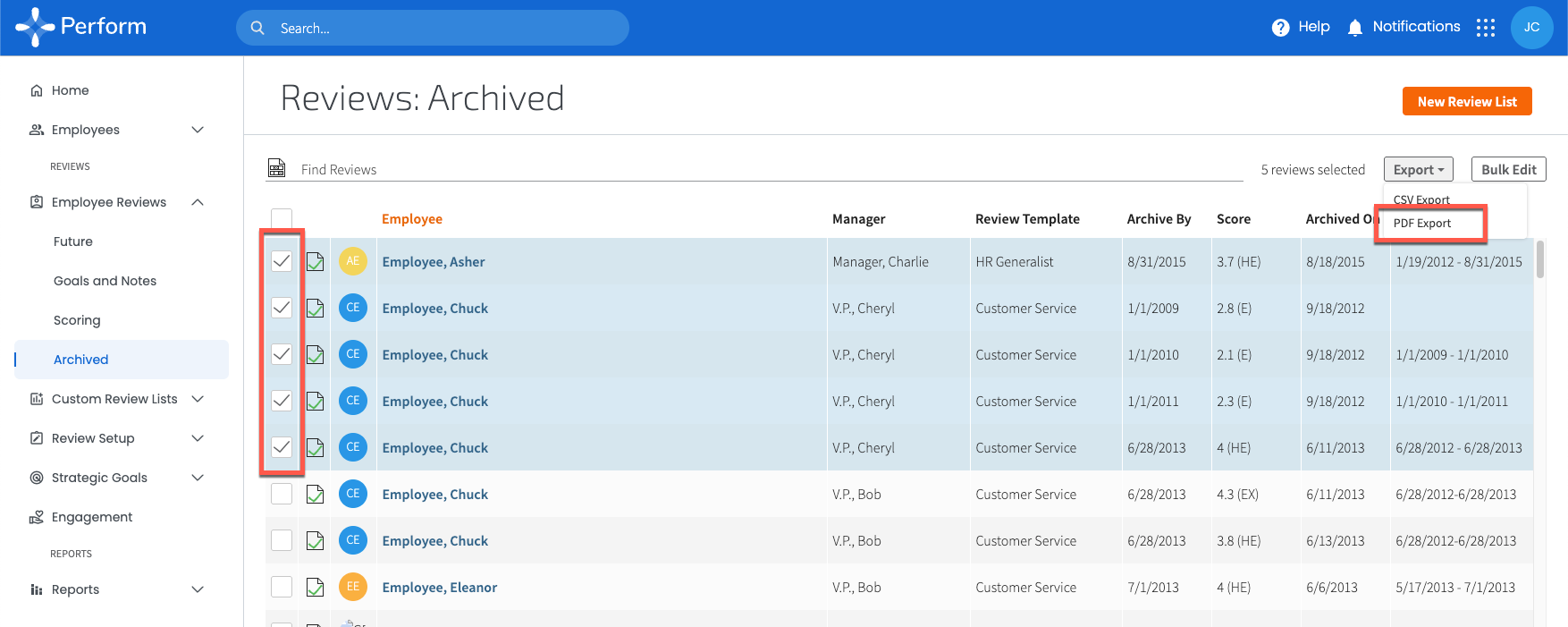 If you need to keep a record of employee reviews, PDF copies of review documents can be exported from Perform in bulk. This is helpful to back up review documents or if you need to print a large number of employee reviews.