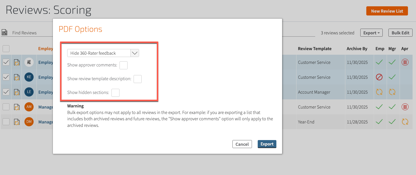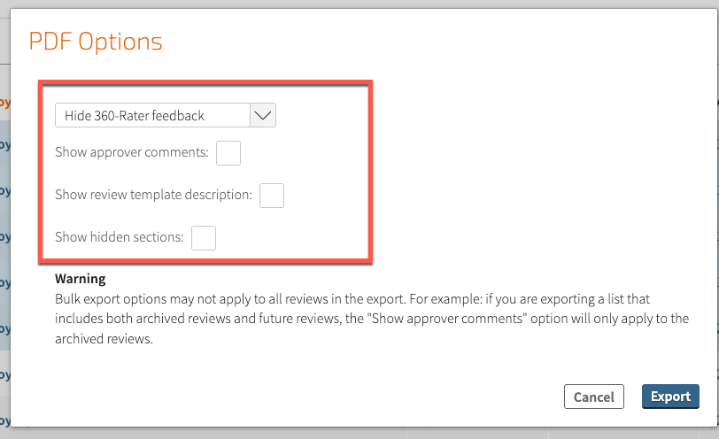 Choose any additional content you want to include in your PDF versions besides the manager and employees' scores and comments. Then click Export.