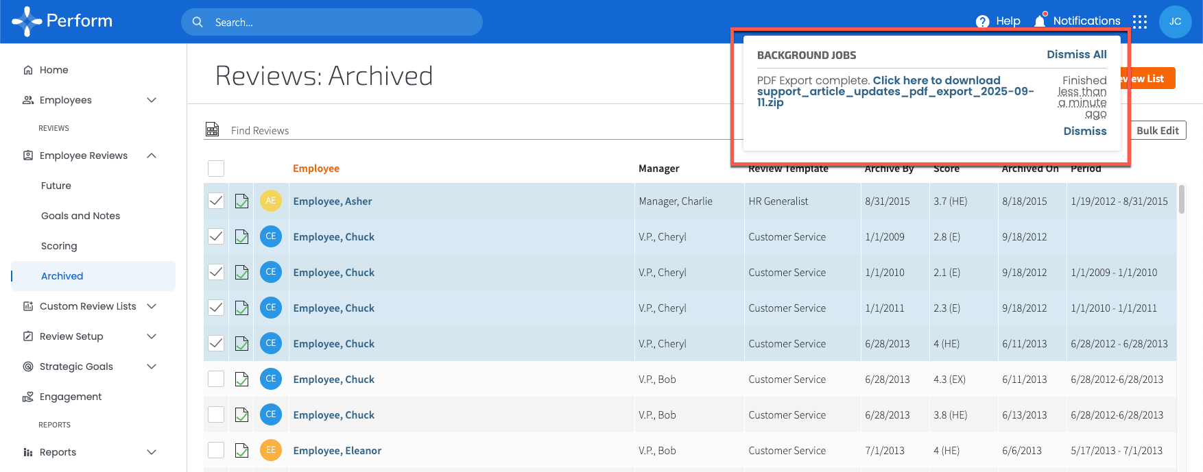 Note: Depending on the number of reviews you choose to export, this may be a time-intensive task. Once you begin the export process, you are free to leave Perform, and we will email you a link to download the zip file containing all of your PDFs. The zip file will remain active for seven days. If you have not accessed the zip file within seven days of exporting, you will need to re-export the review documents.