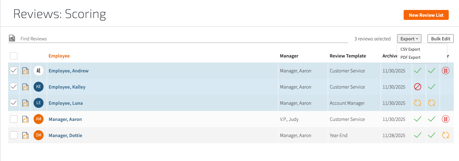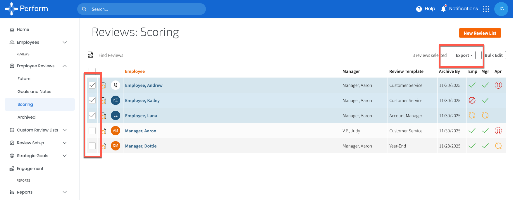Select the reviews that you would like to export by checking the box to the left of the employee's name.