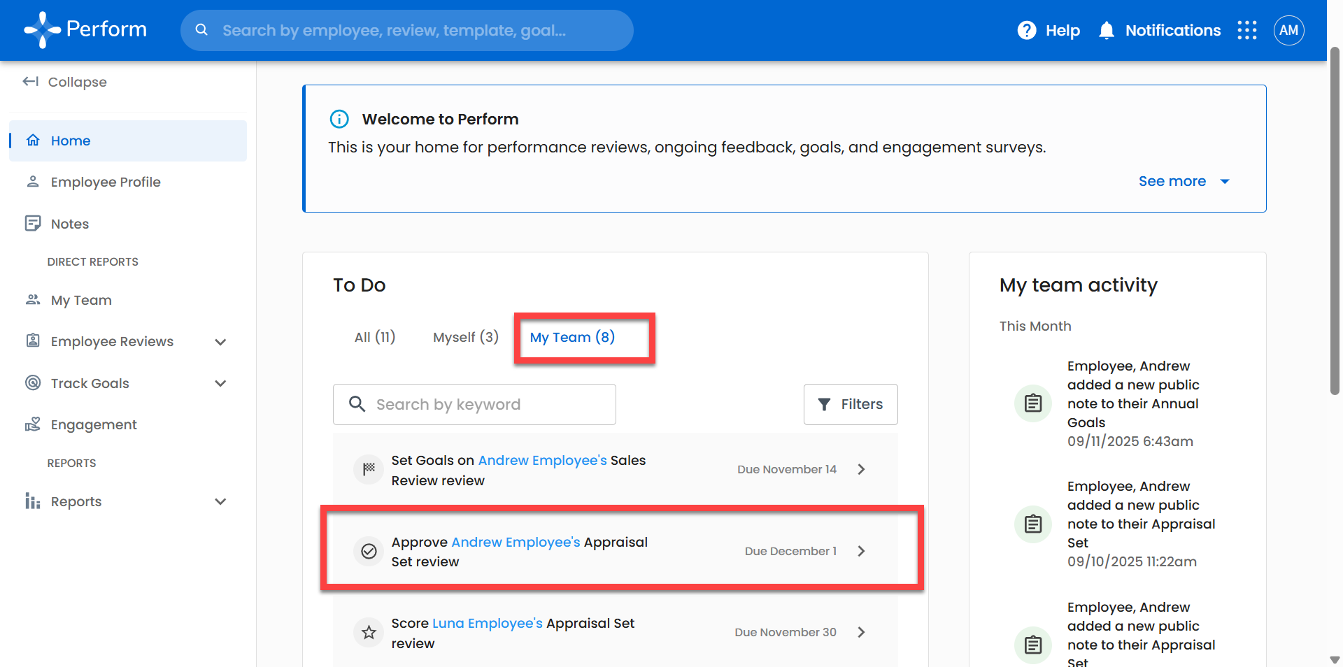 Select the Employee under Direct Reports on your homepage: