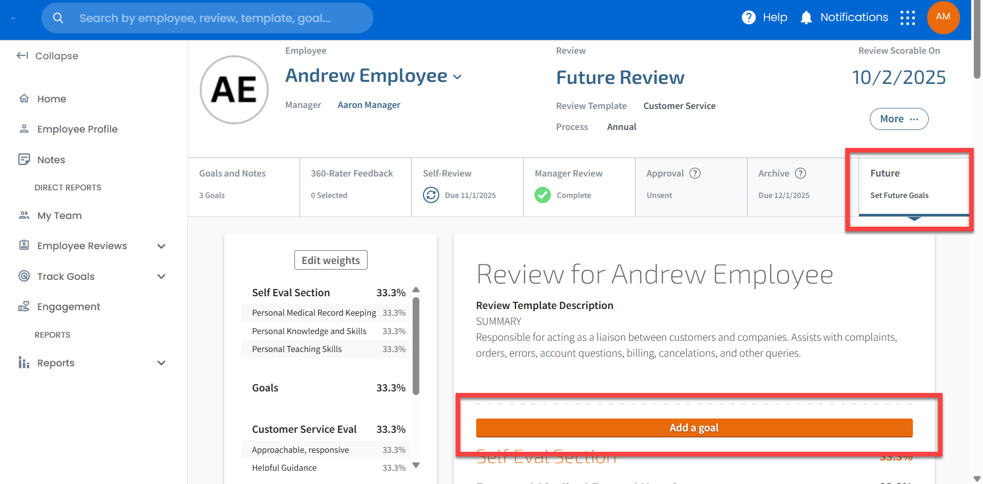 Future reviews may be a good fit if your organization's process is to evaluate and discuss an employee's recent performance and simultaneously set upcoming goals for the next review cycle.