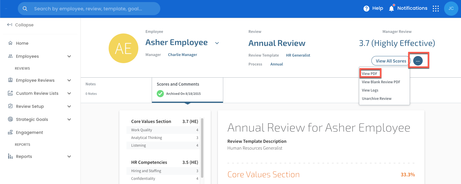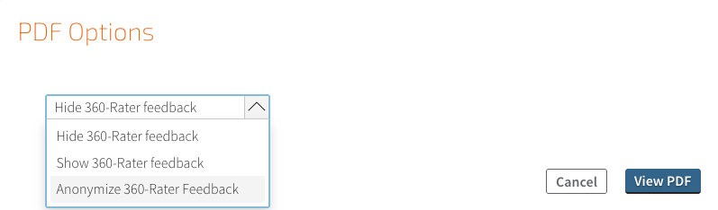 Option 1: The manager or site admin can make a PDF of the review. When generating the PDF, the manager can choose to “Hide,” “Show,” or “Anonymize” the 360-rater feedback. Anonymizing the feedback will reveal all ratings and comments but redact the 360-rater’s names. This PDF can then be shared with the employee via printout, email, or uploaded to the Employee Folder.