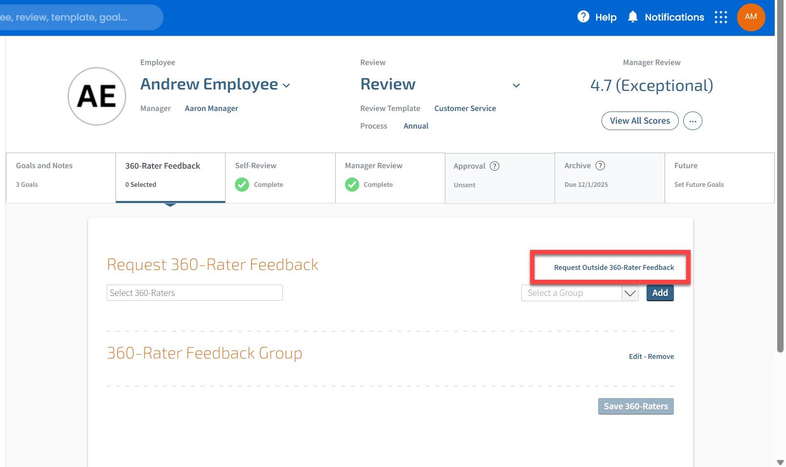 When you are done adding Outside 360-Raters, select Save 360-Raters in the lower right corner, and an email notification will be sent to the outside 360-Rater requesting them to provide their feedback.