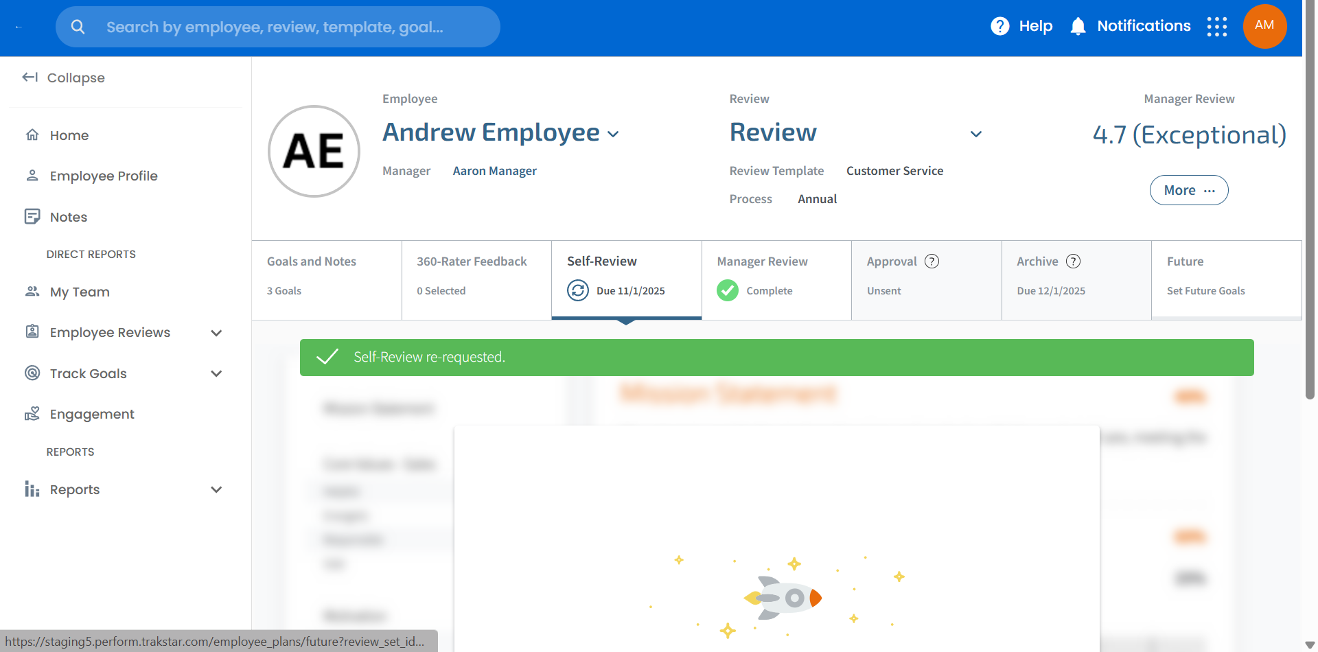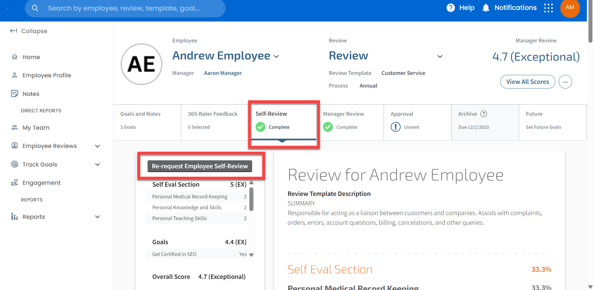 Note: Once you have re-requested an employee's self-review, you will not be able to view your employee’s self-review again until they re-submit.