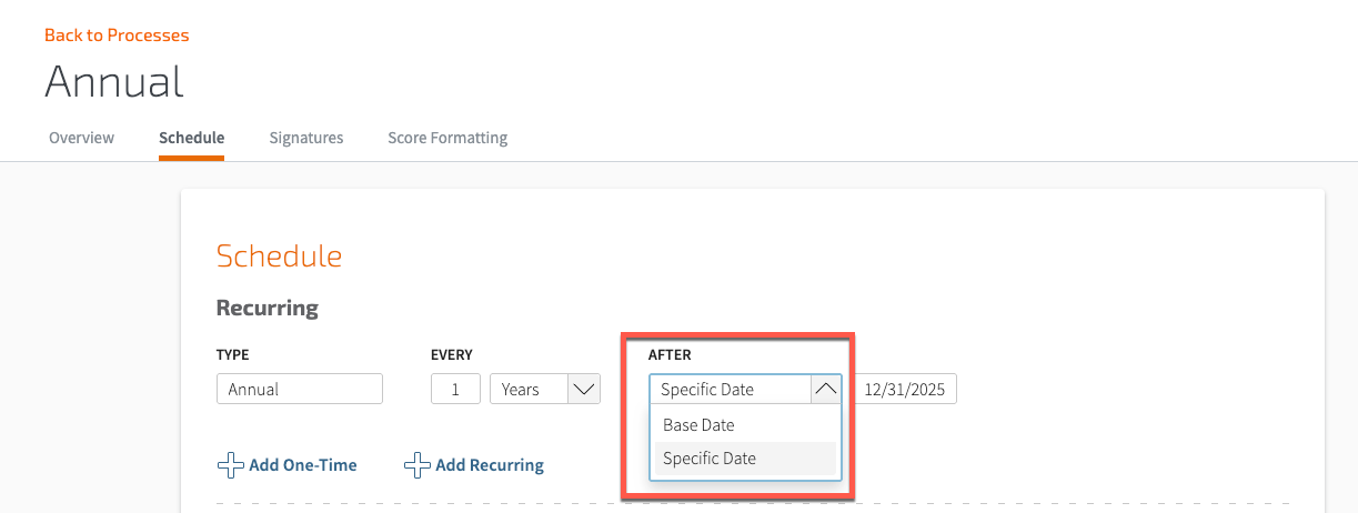 Within the Schedule tab, you can set the archive date from within the Specific Date field. If your company prefers to set up reviews based on employee anniversary dates, you can also select the drop-down and choose the Base Date option.