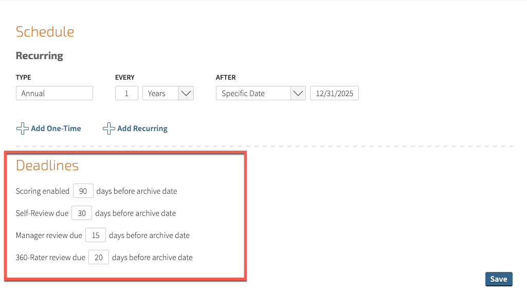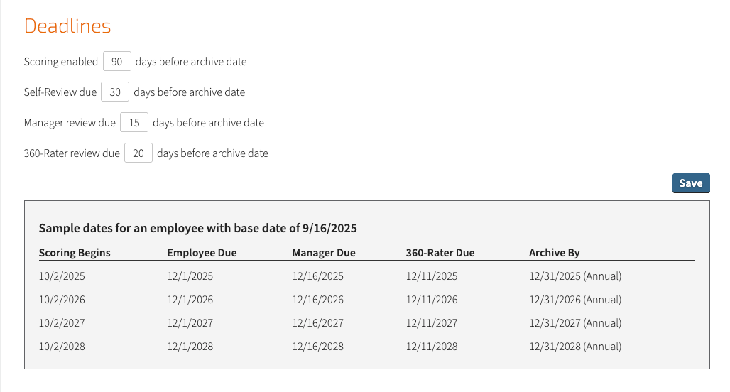 While the archive date represents the final due date that all steps in a review cycle should be completed by, there are some additional deadlines you can set within the process as well, such as when scoring will begin, when the self-review should be done, and when manager reviews should be completed.