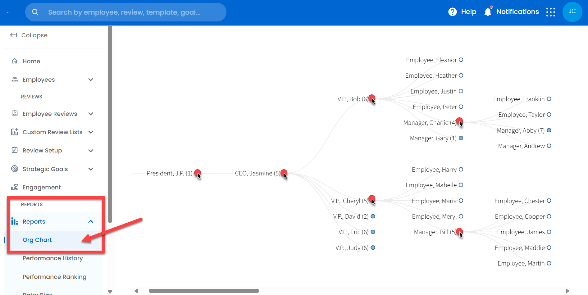 To access this report, select the dropdown arrow next to the Reports tab located to the left of your screen. You can then select the Organization Chart tab.