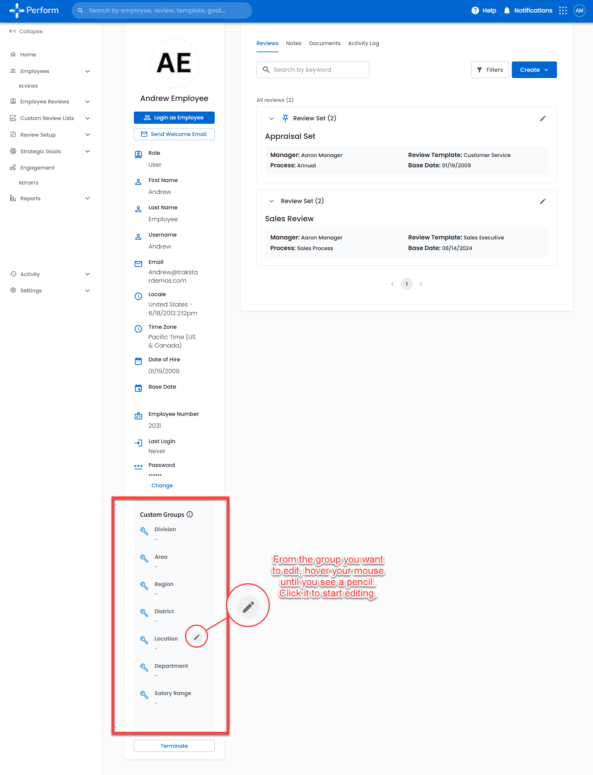 Step 5: Scroll down to find 'Custom Groups' under the employee profile. Hover your mouse to the group you wish to edit, then click the pencil.