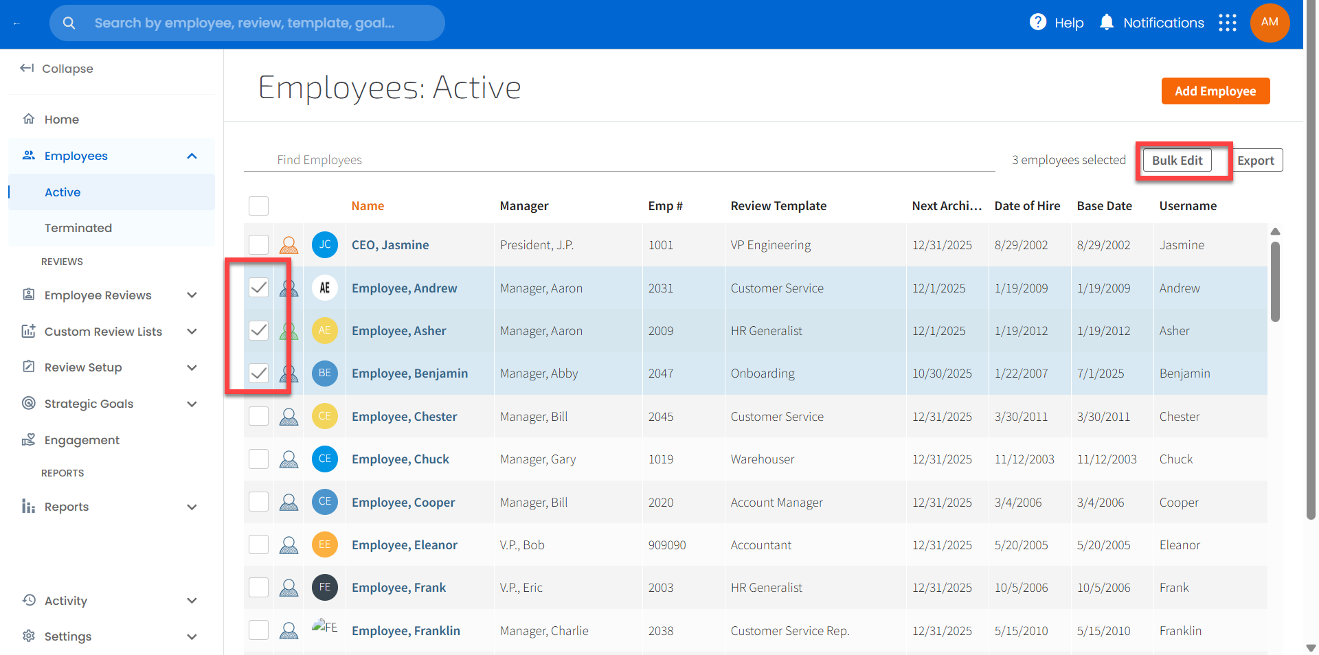 Step 7: To assign a Group to multiple employees simultaneously, select multiple employees from the Employee list. Click Bulk Edit.