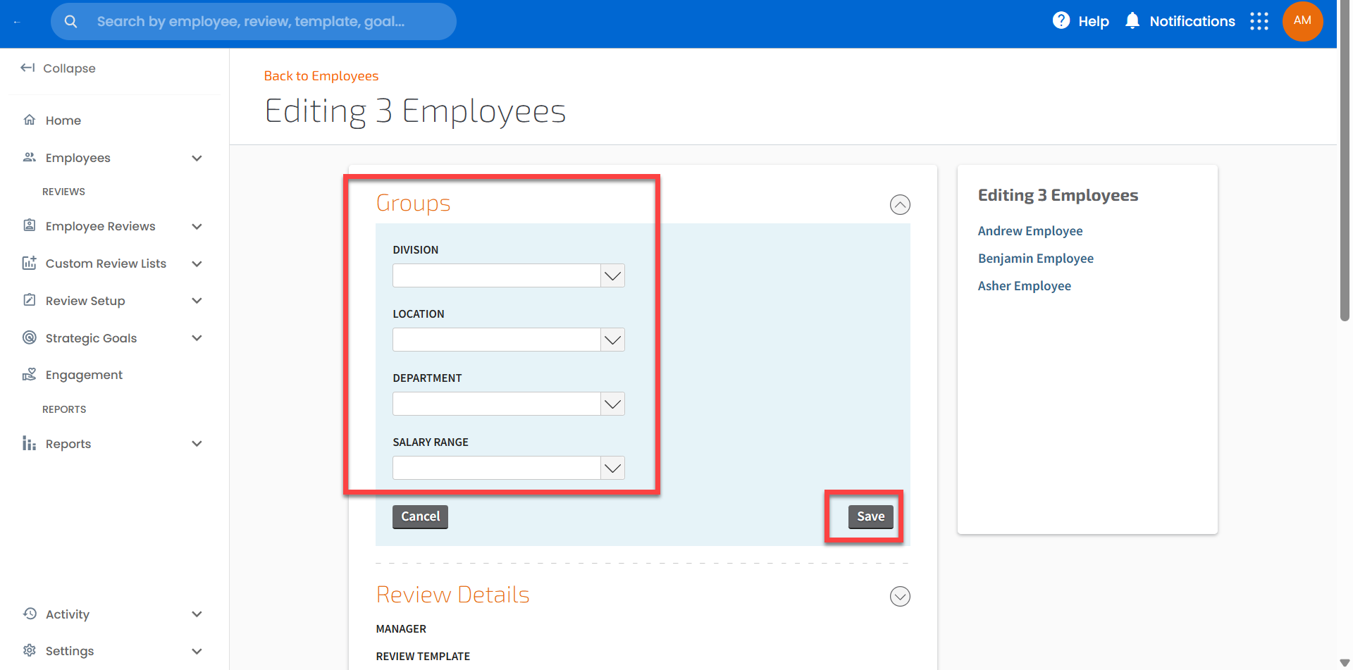 Step 6: Assign the employee to the desired groups using the drop-down menus. Click Save.