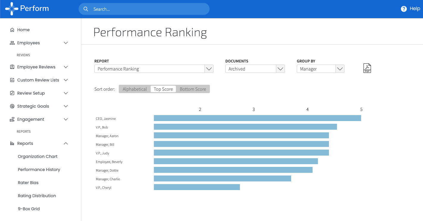 The Performance Ranking Report is a ranking that compares each employee’s scores. This report can be filtered by competency and department.