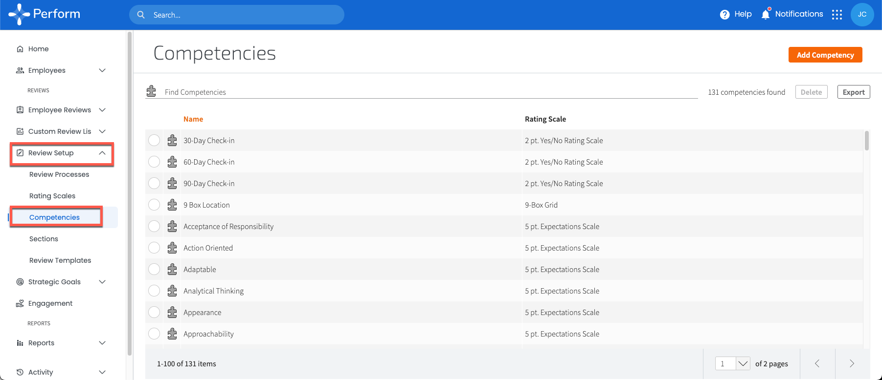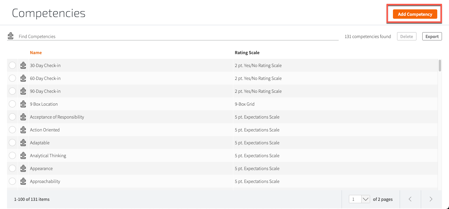 Here, you will be able to view all of the competencies that exist in your library. If there are competencies that your company uses that are not part of the competency library, you can create as many competencies as you need. To do this, you can select the orange Add Competency button located in the top-right corner of the competency library screen.