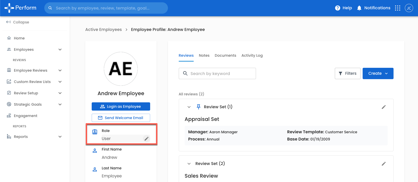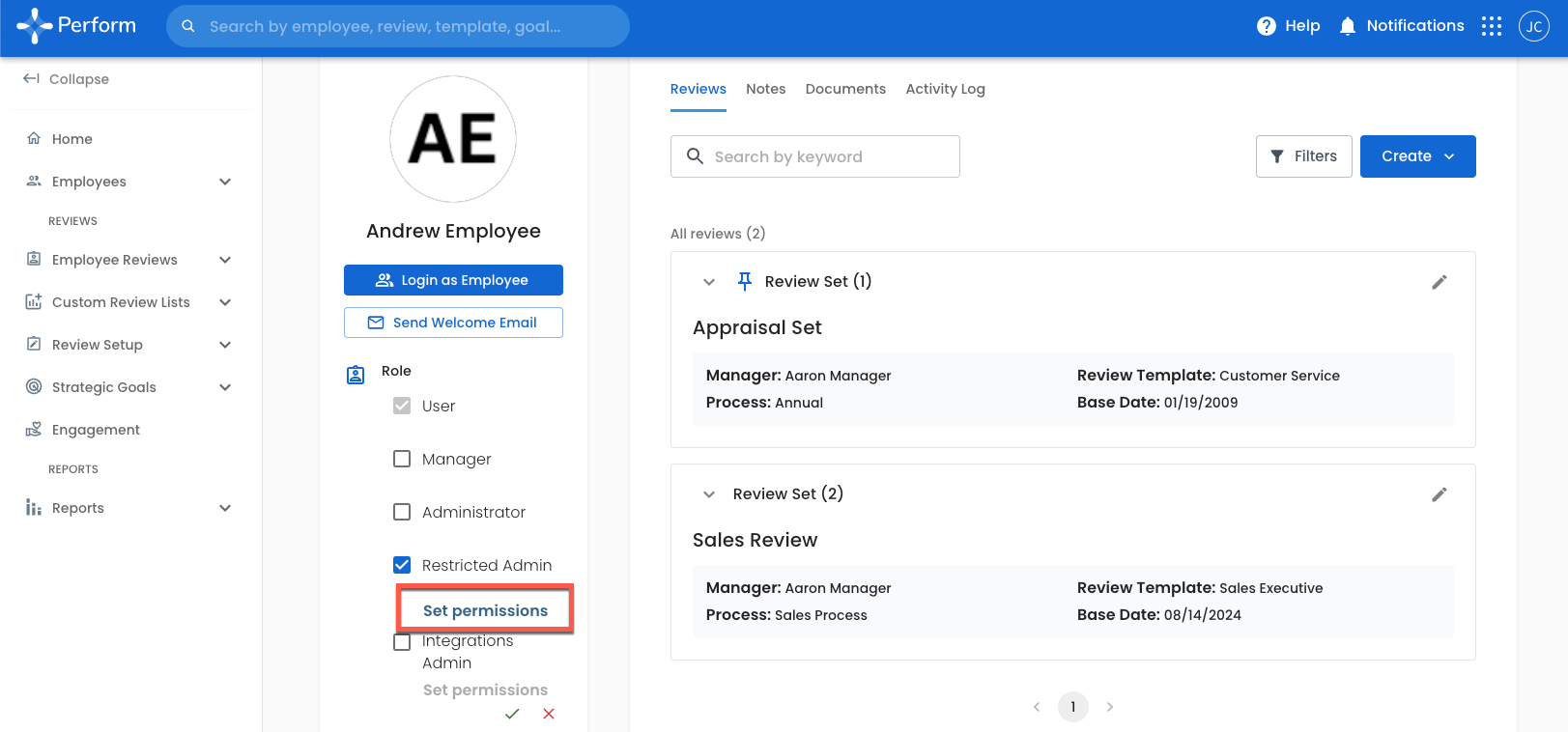 Follow the steps below to grant Restricted Admin permissions to a user within the Perform system.