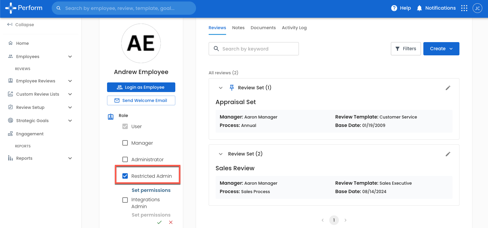 If you currently do not have the option for Restricted Admin within Perform, reach out to your account manager or the support team!
