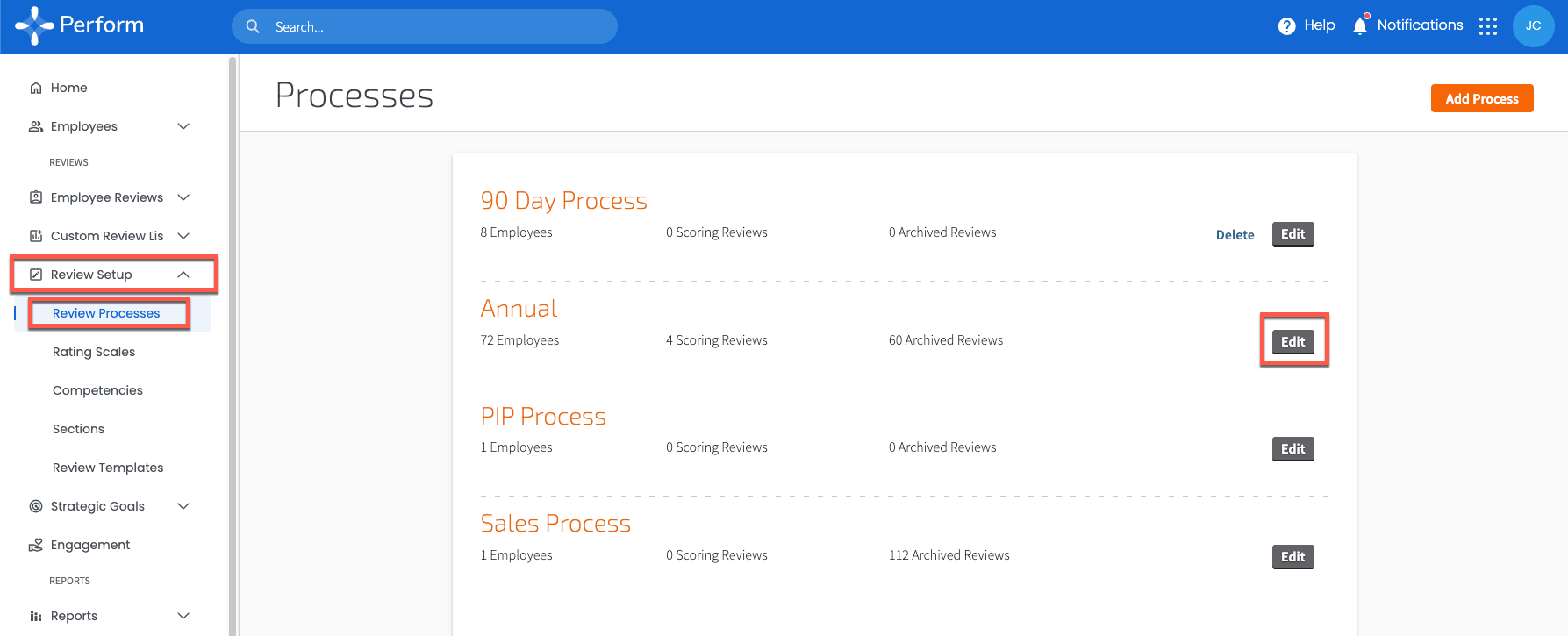 Step 1: Under the Review Setup menu tab, select the Review Processes tab from the Navigation Bar, then click Edit next to the Process you wish to update