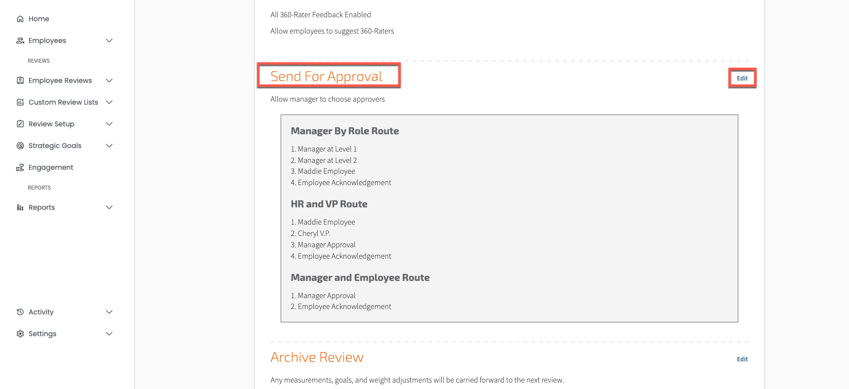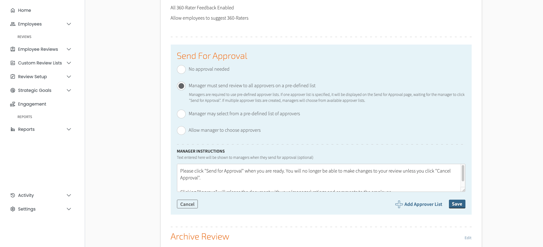 - If you are considering incorporating higher-level managers as approvers, keep in mind that all manager users will have visibility into the appraisal documents of their reporting downline upon archive.