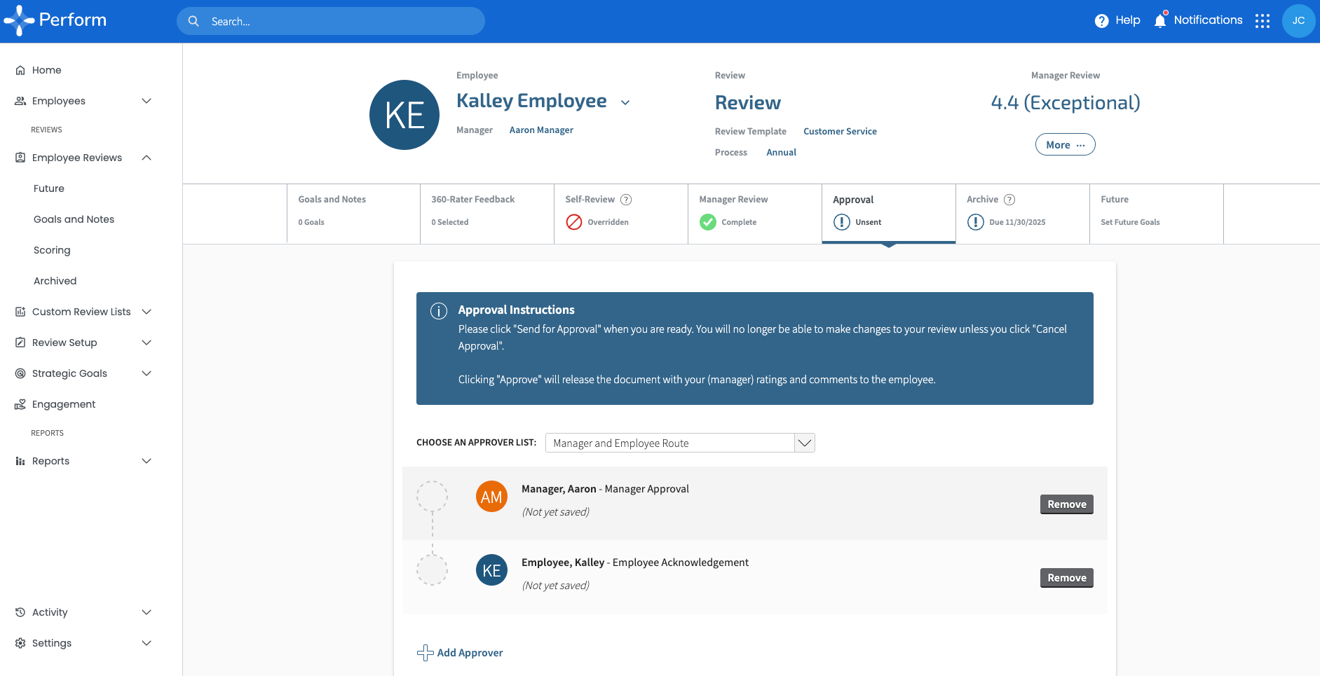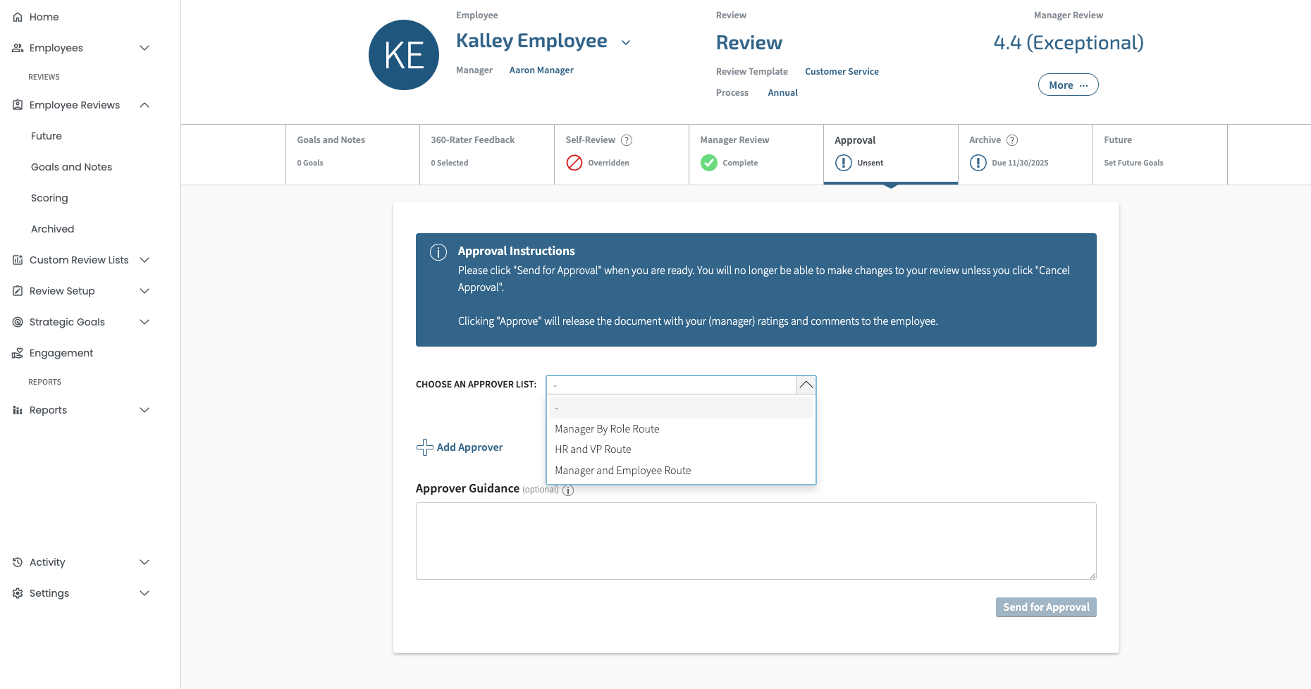 - Approvers will have full visibility into the employee self-appraisal (if applicable), manager review, measurements, and any multi-rater feedback (if applicable)