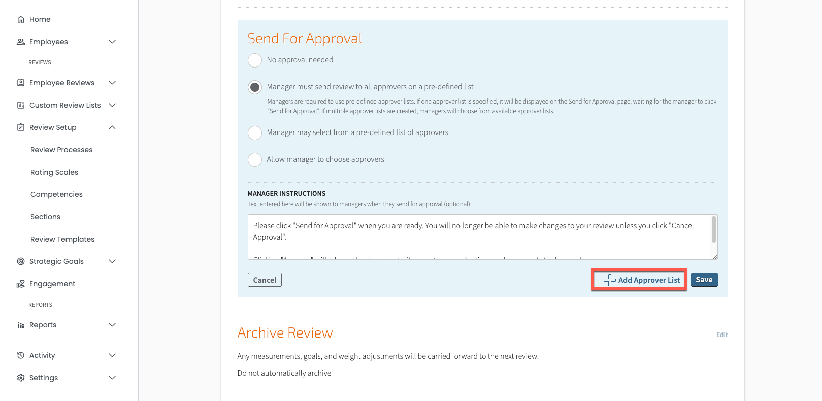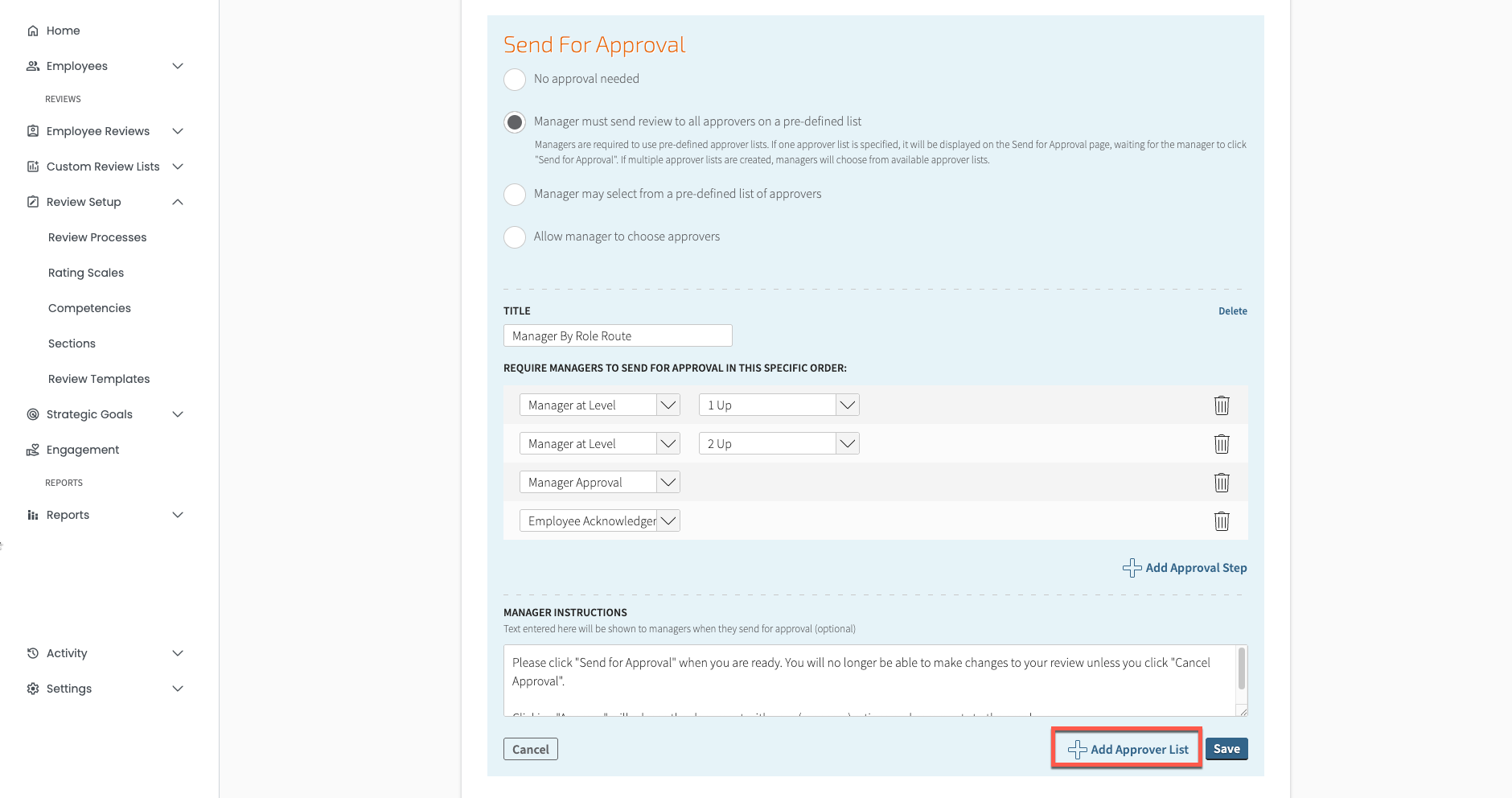 Step 6: If you would like to allow managers to choose from multiple approval lists, click Add Approver List to add additional routes