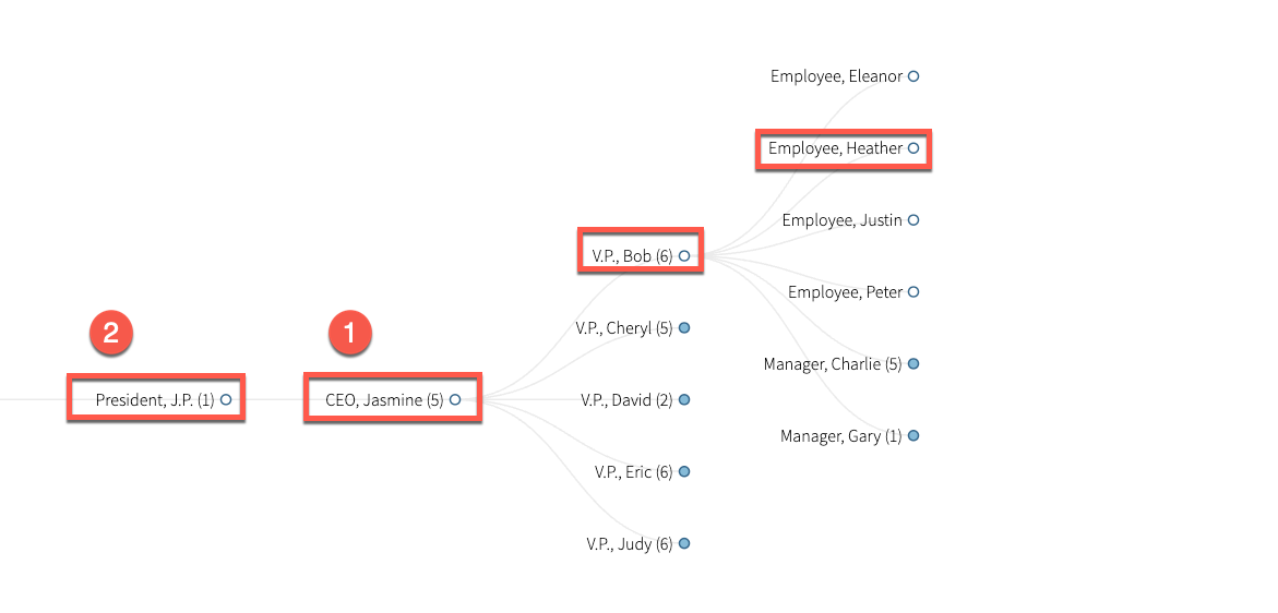 Ex: Bob V.P. is evaluating Heather. Jasmine is Bob's manager. Therefore, the 1-up for Heather's appraisal is Jasmine. The 2-up is J.P. President.