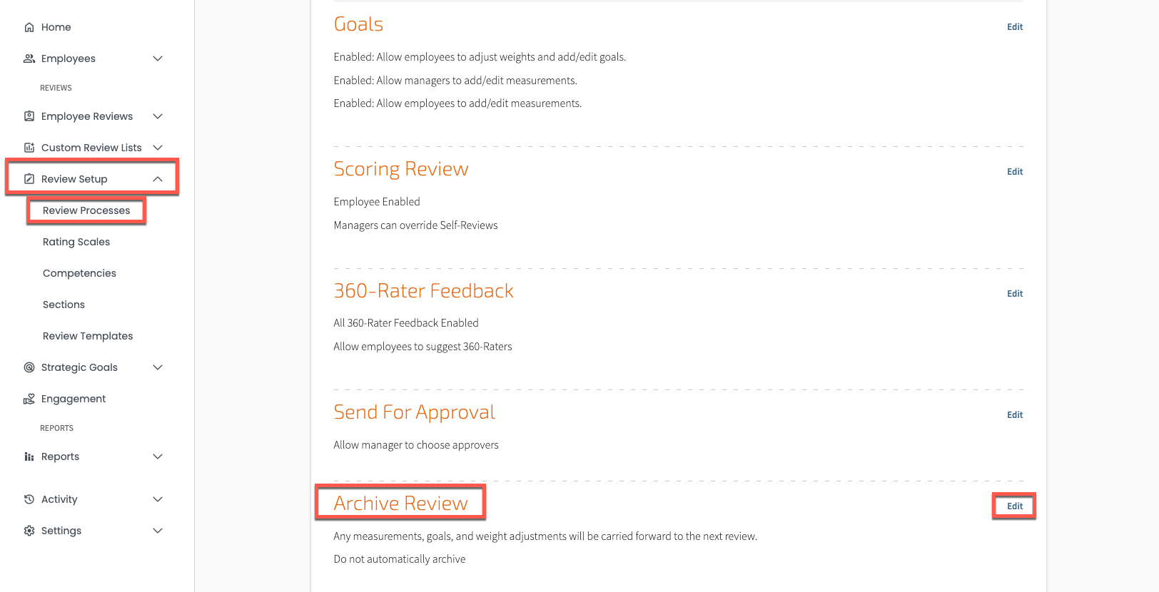 To set up Auto Archive, start by going to Review Setup and selecting the Review Processes tab, and then click Edit next to Archive Review.