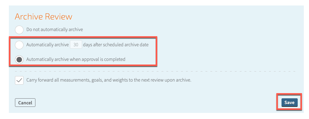 Next, choose whether you would like appraisals archived a certain number of days after the (target) Archive Date or if they should be archived once approval is completed*. You can also choose whether or not to carry forward all goals, measurements, and weights to the next appraisal cycle. Once finished, Save your changes.