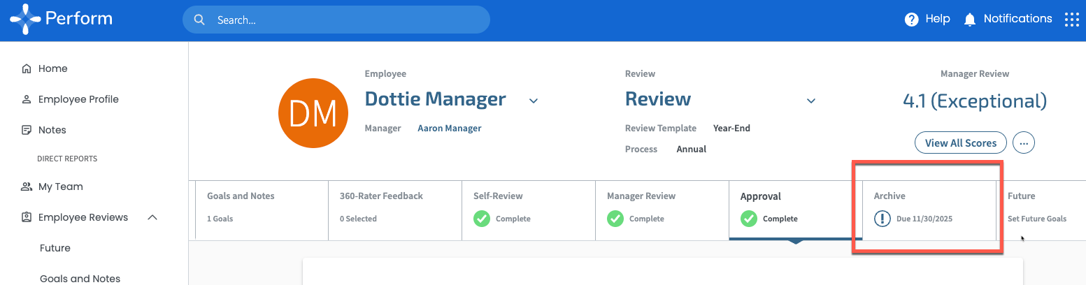 Suppose Auto Archive is disabled or you’ve chosen to archive appraisals a certain number of days after the (target) Archive date. In that case, Managers can choose to archive the appraisal manually if completed.
